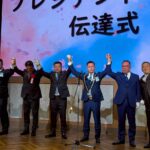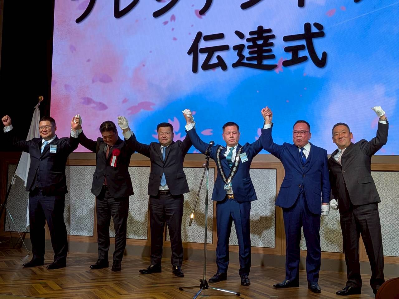さらに、本年度理事長瀬川智広君から、次年度理事長中村光彦君へ、プレジデンシャルリースの伝達式が、歴代理事長の手によって行われ、中村君より次年度の抱負と意気込みが語られました。