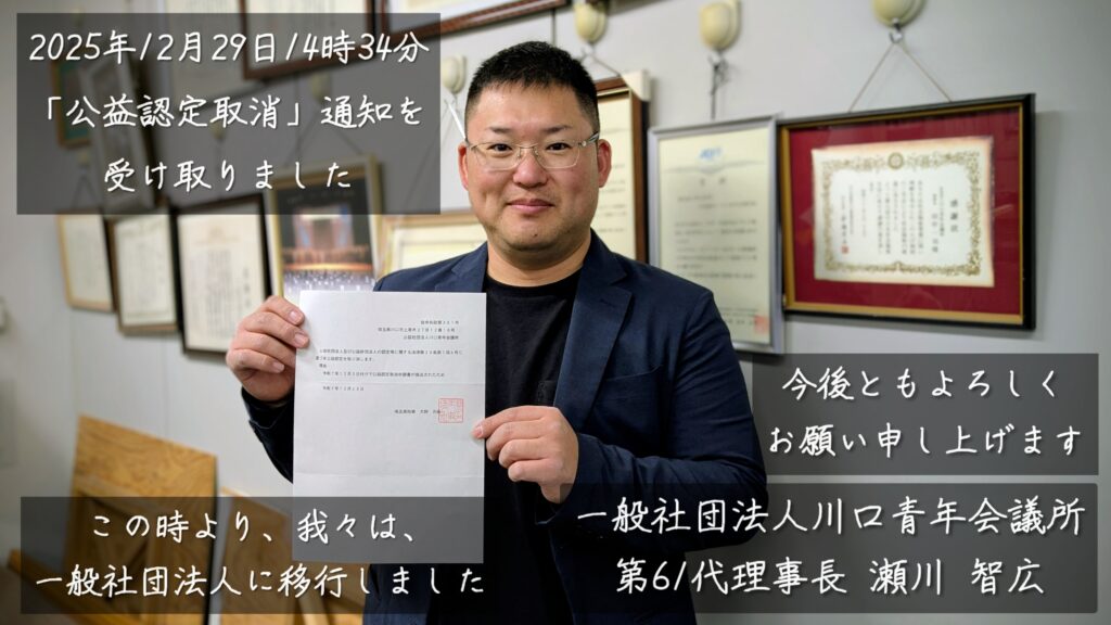 公益社団法人川口青年会議所は、2025年12月3日付で公益認定取消申請書を提出し、同年12月29日付で埼玉県より「公益認定取消」の通知を受領いたしました。